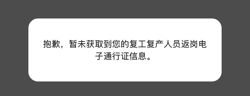 “复工证”“通行证”个人无需申领,由相关企业向经信、商务、邮政等行业主管部门集中申领。所以,目前大多数人点击复工证,应该会显示当前没有复工复产返岗电子通行证的状态。