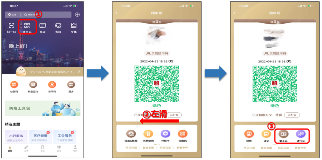 符合复工复产条件的企业需返岗人员联系所在居村委,打开“随申办”APP或“随申办”微信、支付宝小程序,点击“随申码”。在“随申码”页面下方,滑动选择“复工码”,点击即可“亮码”。